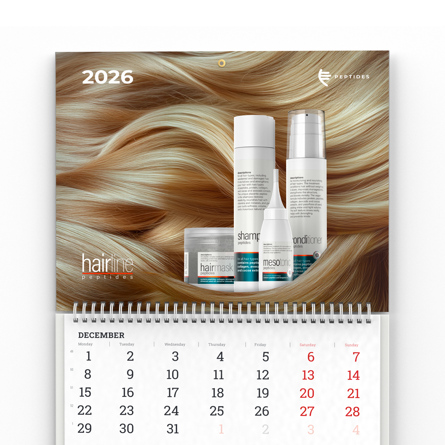 This vibrant calendar in Peptides’ signature style will not only be a convenient planning tool but also a stylish element of your workspace. The calendar’s design has been crafted with particular attention to detail, reflecting the core values of the company — innovation, harmony, health, and beauty. The color palette and design elements symbolize the unity of products aimed at supporting your well-being and inner balance.