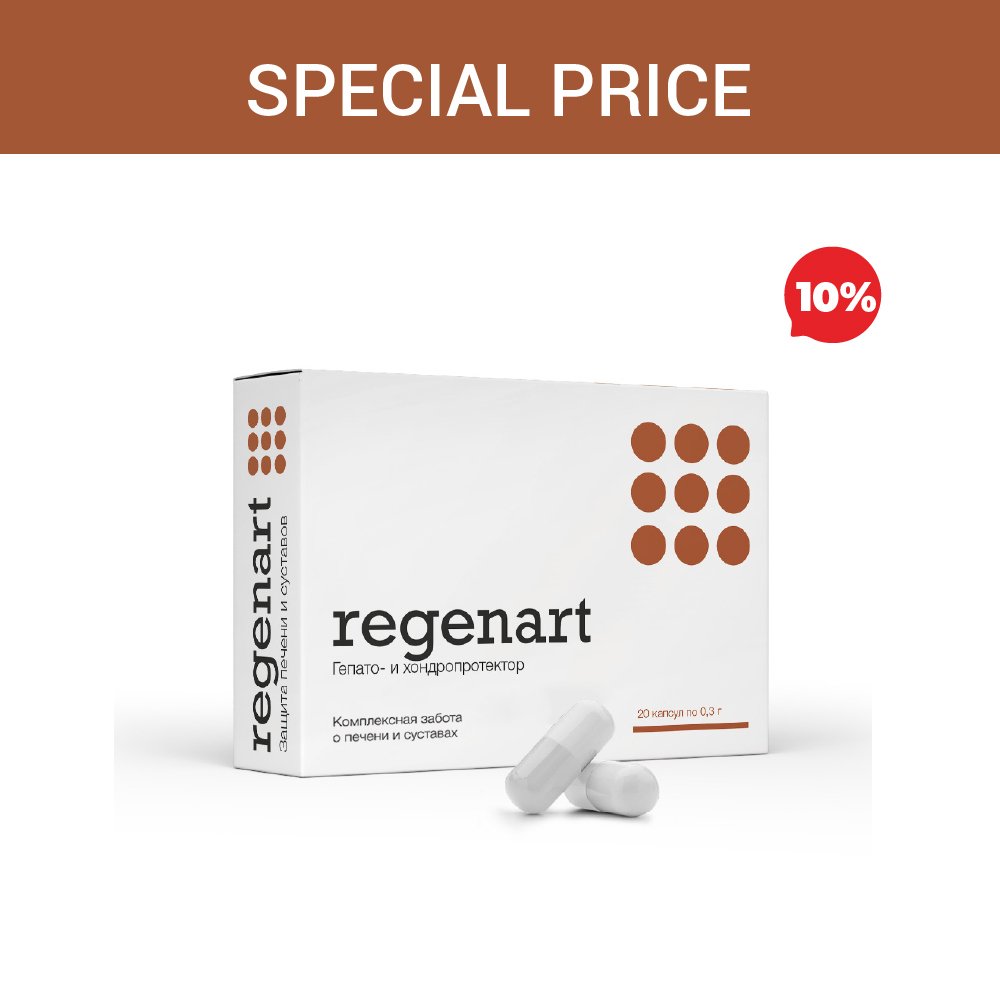 Complex preparation on the basis of dandelion root extract, artichoke, chondroitin sulphate and dihydroquercetin. 'Regenart' accelerates the course of liver detoxication processes, and also regeneration of cartilaginous tissue and joint surfaces, improving mobility in joints. It is applied at arthroses, arthritises, osteochondrosis, chronic liver and bile passages diseases. Interferes cirrhosis development.